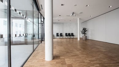 Ausstattung: Stühle, Tische, Innenjalousien zum Abdunkeln und als Sichtschutz, Küche, Beamer und Leinwand.