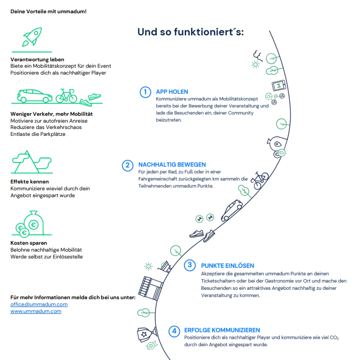 Es gibt verschiedene Möglichkeiten, deine Gäste zu motivieren, umweltfreundlich zu Fuß, mit dem Fahrrad, in Fahrgemeinschaften oder mit öffentlichen Verkehrsmitteln anzureisen. Eine Möglichkeit ist die Kooperation mit ummadum. ummadum ist eine App-basierte Mobilitätsplattform, die Menschen dazu motiviert, umweltfreundliche Fortbewegungsarten wie Zufußgehen, Radfahren, öffentliche Verkehrsmittel oder Fahrgemeinschaften zu nutzen.