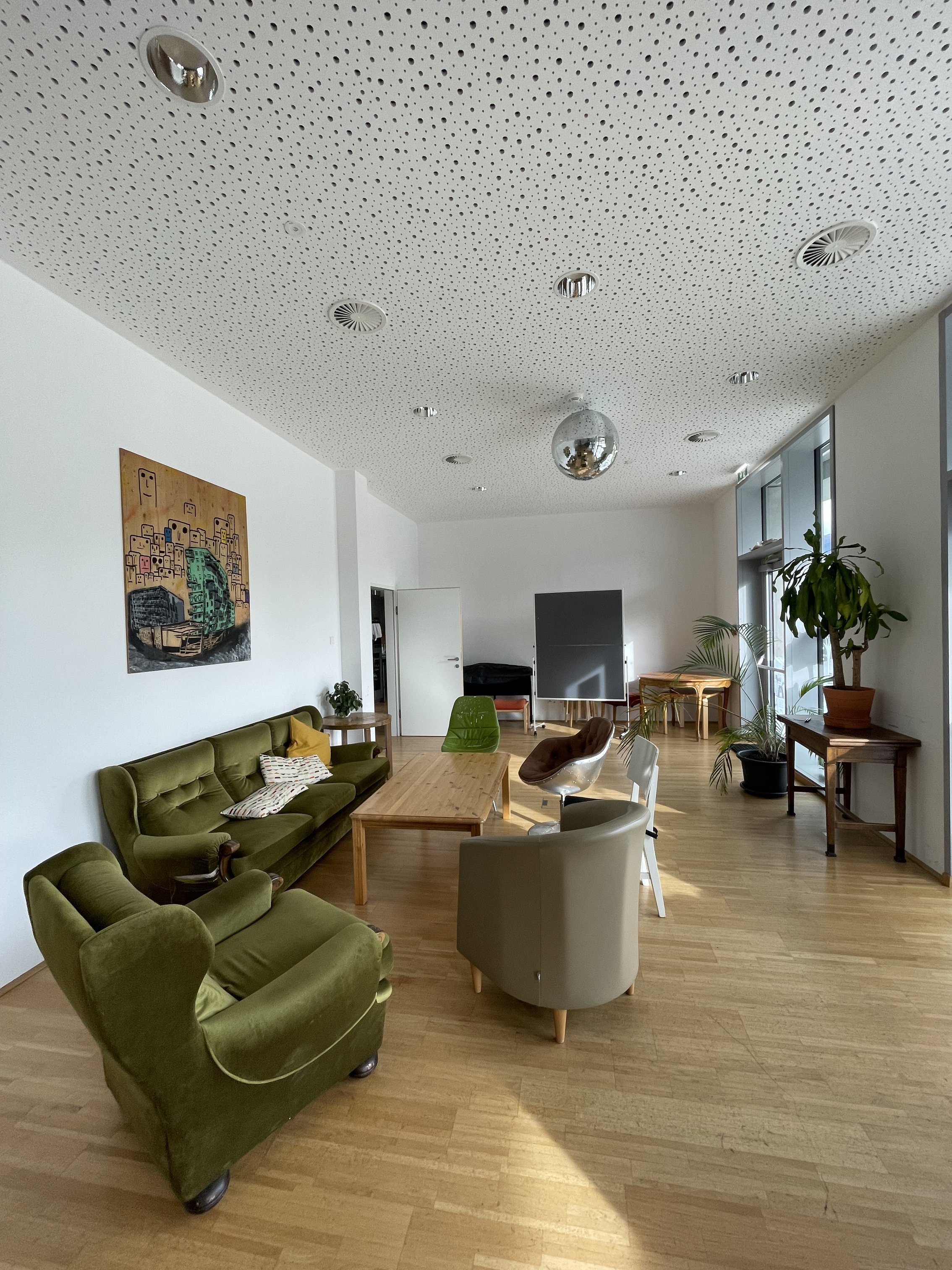 Ausstattung: Wir verfügen sowohl neben einem Couch Setup für einen gemütlichen und vertraulichen Austausch als auch über die Möglichkeit, für Vorträge oder Diskussionen für etwa 70 Personen zu bestuhlen. Für Workshops oder Seminare stehen neun Tische zur Verfügung. Außerdem kann bei Bedarf auf einen leistungsstarken Beamer zurückgegriffen werden.